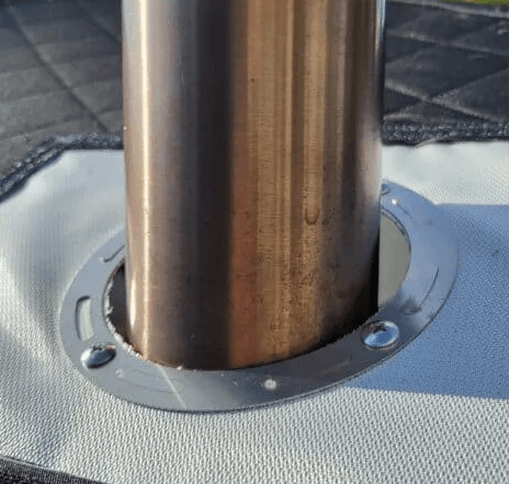 Das Kaminloch im Zeltdach ist extra etwas grösser geschnitten damit die Frischluftzirkulation im Zelt immer gewährleistet ist. Die Frischluft wird hinter dem Ofen angezogen und durch diese Aussparung abgeführt. So hast du die ganze Zeit frische Luft zum Atmen.
