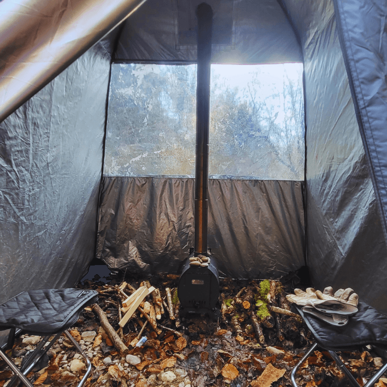 🏕️ Zweilagiges AlpineTex-Zelt – bestehend aus Innenzelt und Aussenzelt, wärmereflektierend, feuerfest & wasserdicht, getestet bei -10 °C.